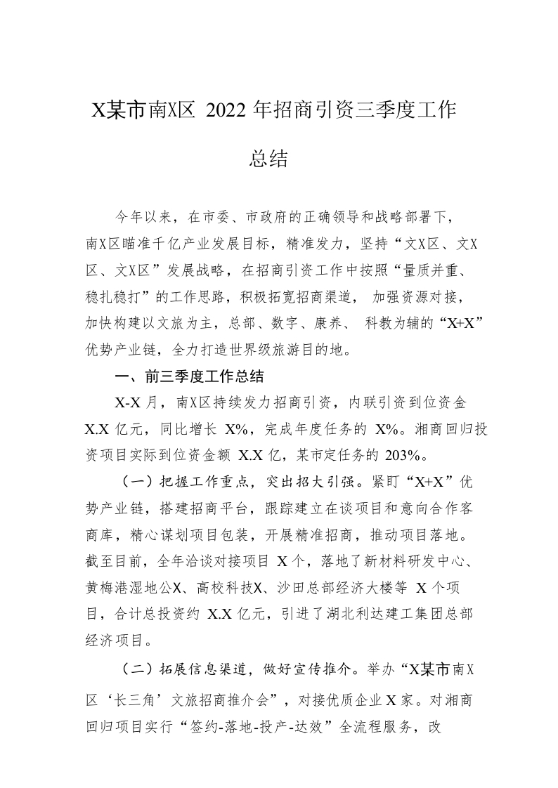/ XX市南湖新区2022年招商引资三季度工作总结(20221108)
