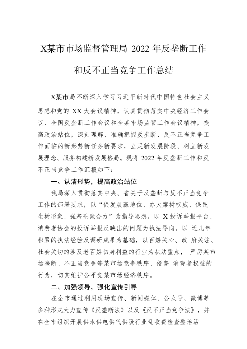 / XX市市场监督管理局2022年反垄断工作和反不正当竞争工作总结