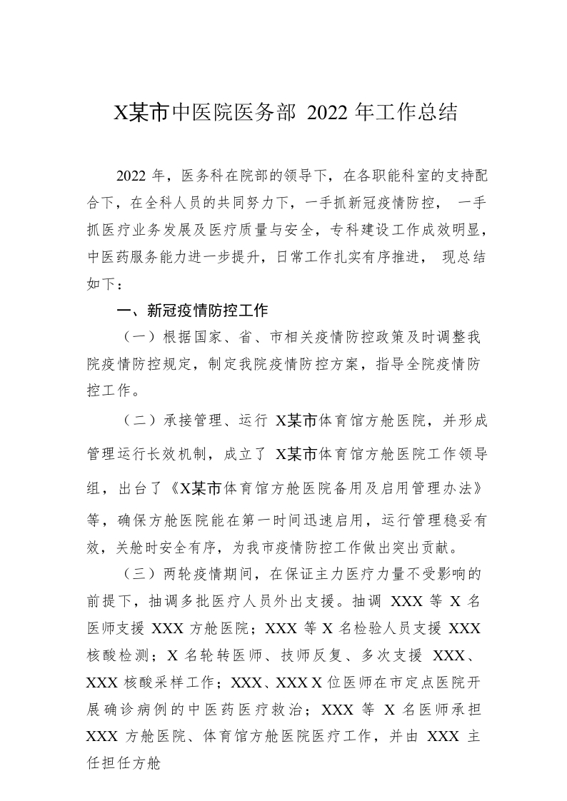 / XX市中医院医务部2022年工作总结