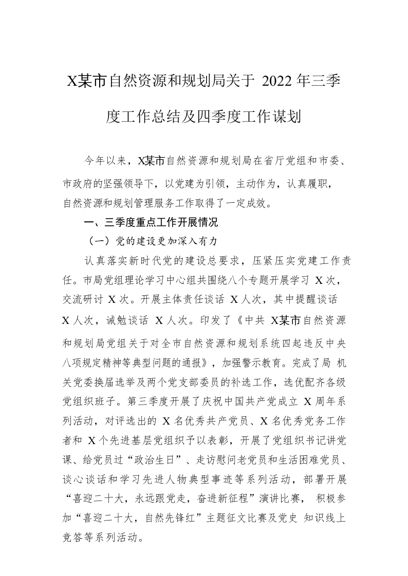 / XX市自然资源和规划局关于2022年三季度工作总结及四季度工作谋划(20221010)