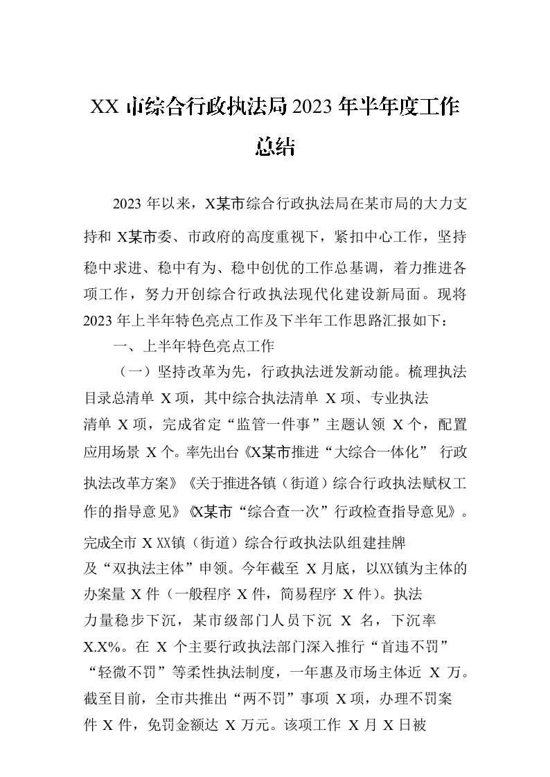 / XX市综合行政执法局2023年半年度工作总结(20230719)