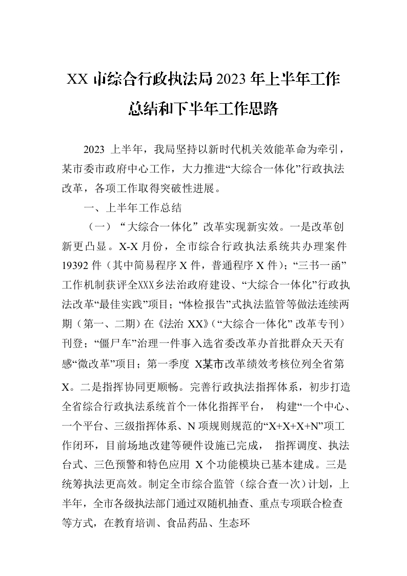 / XX市综合行政执法局2023年上半年工作总结和下半年工作思路(20230720)