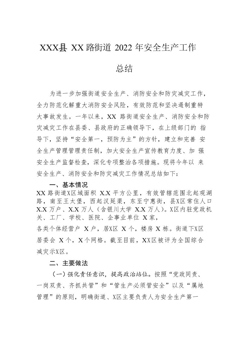 / XX县XX路街道2022年安全生产工作总结(20221125)