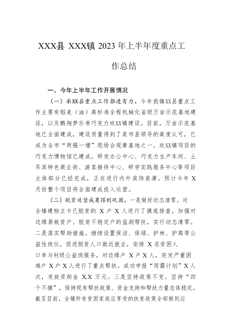 / XX县XX镇2023年上半年度重点工作总结(20230618)
