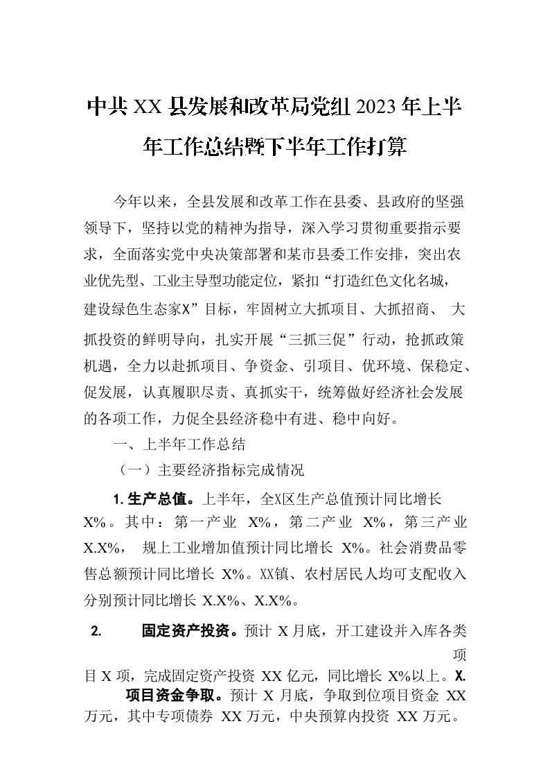 / XX县发展和改革局党组2023年上半年工作总结暨下半年工作打算