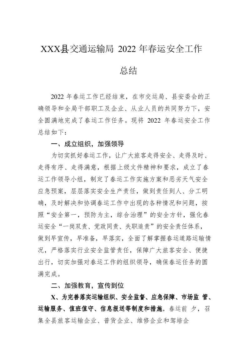 / XX县交通运输局2022年春运安全工作总结(20220310)