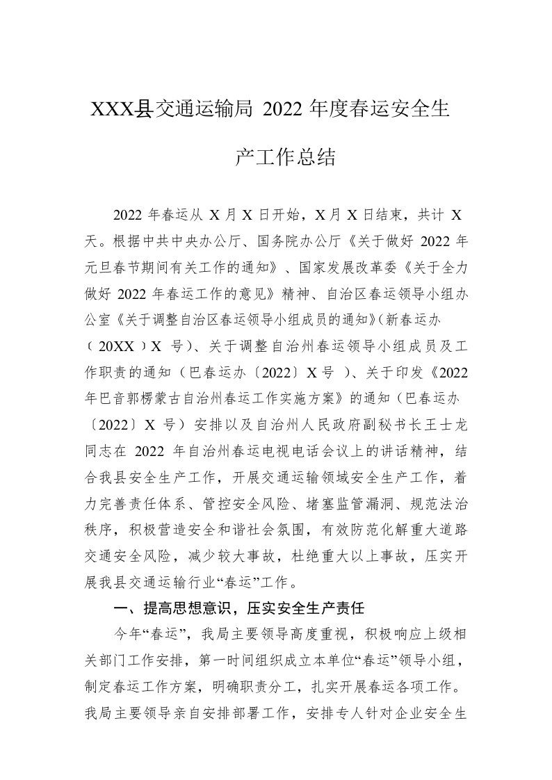 / XX县交通运输局2022年度春运安全生产工作总结(20220510)