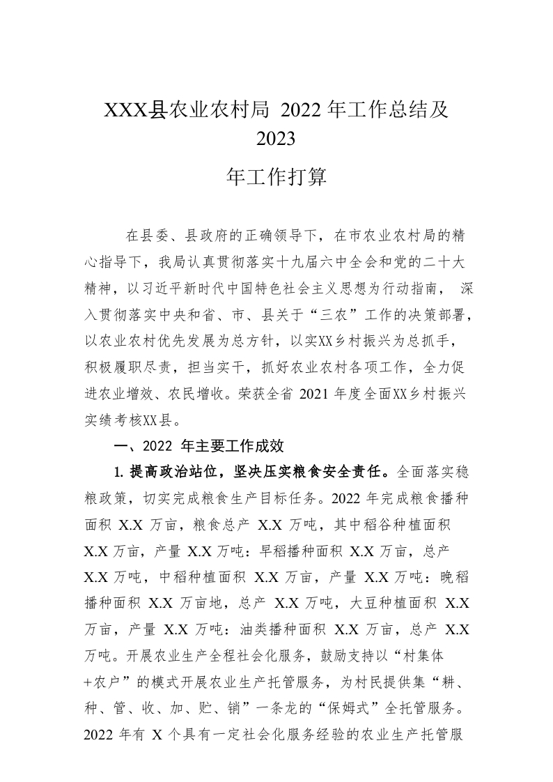 / XX县农业农村局2022年工作总结及2023年工作打算
