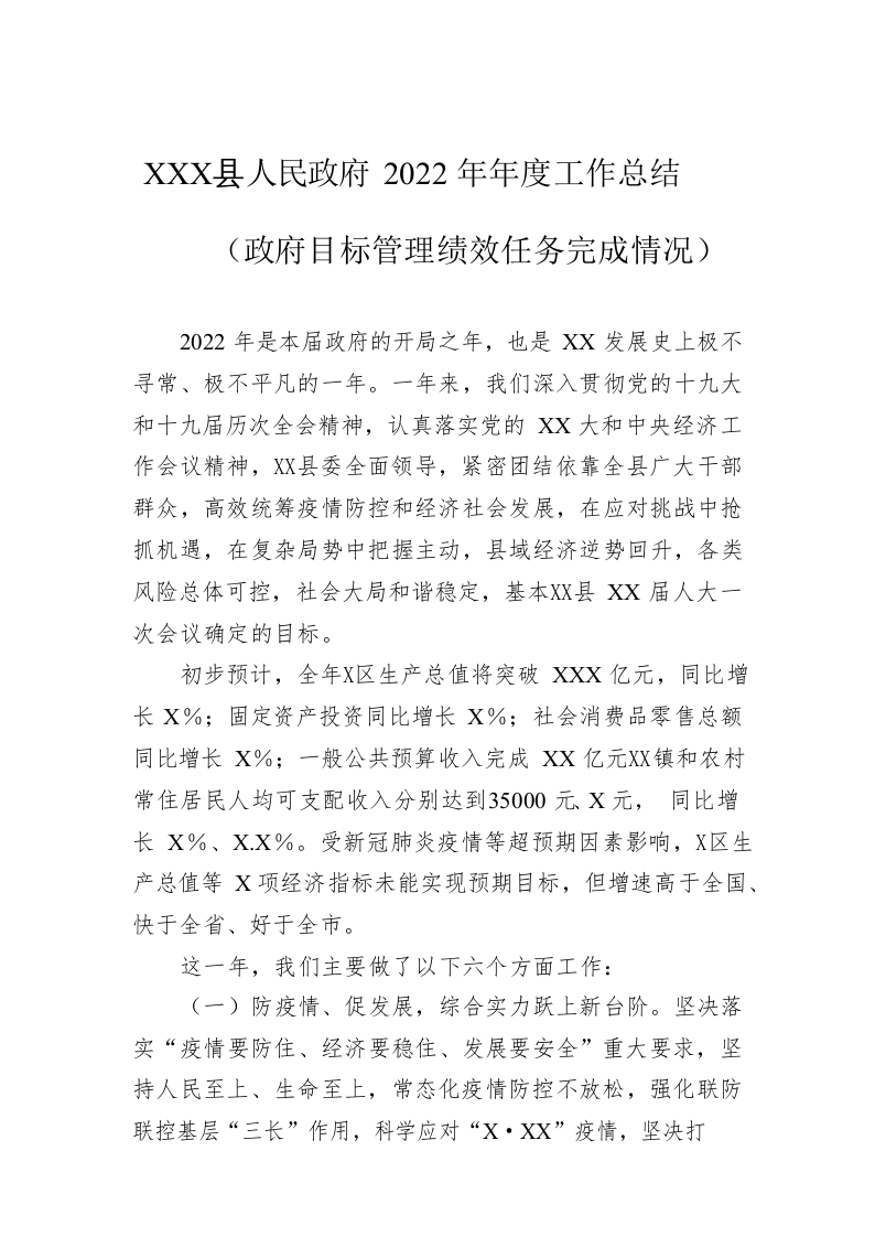 / XX县人民政府2022年年度工作总结(政府目标管理绩效任务完成情况)