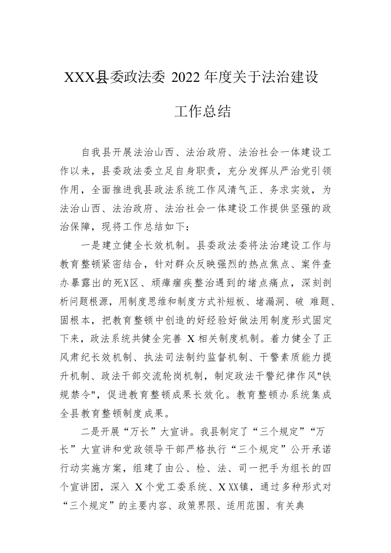 / XX县委政法委2022年度关于法治建设工作总结(20221219)