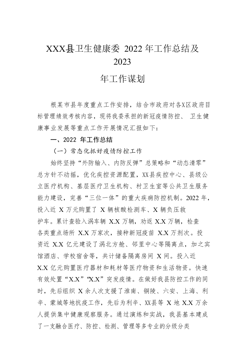 / XX县卫生健康委2022年工作总结及2023年工作谋划