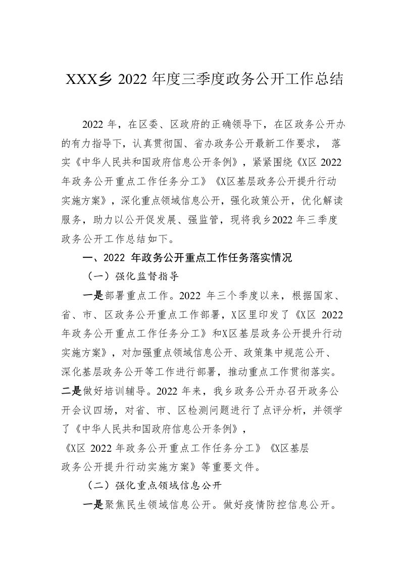 / XX乡2022年度三季度政务公开工作总结(20221120)