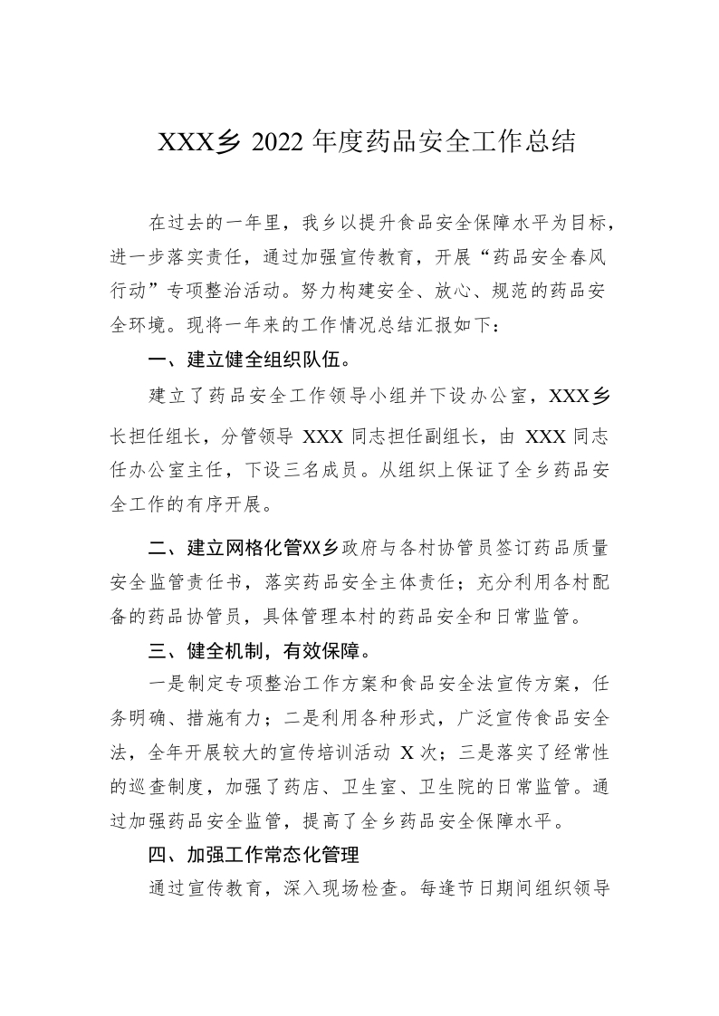 / XX乡2022年度药品安全工作总结