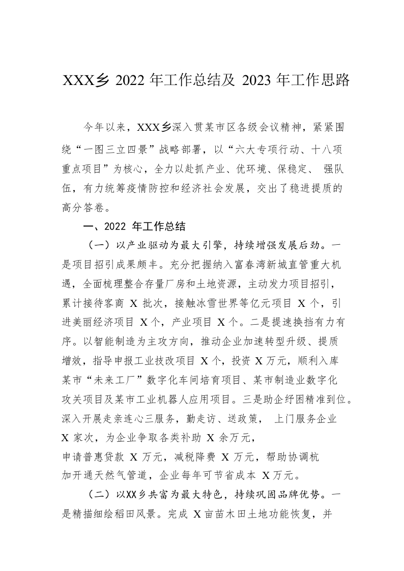 / XX乡2022年工作总结及2023年工作思路