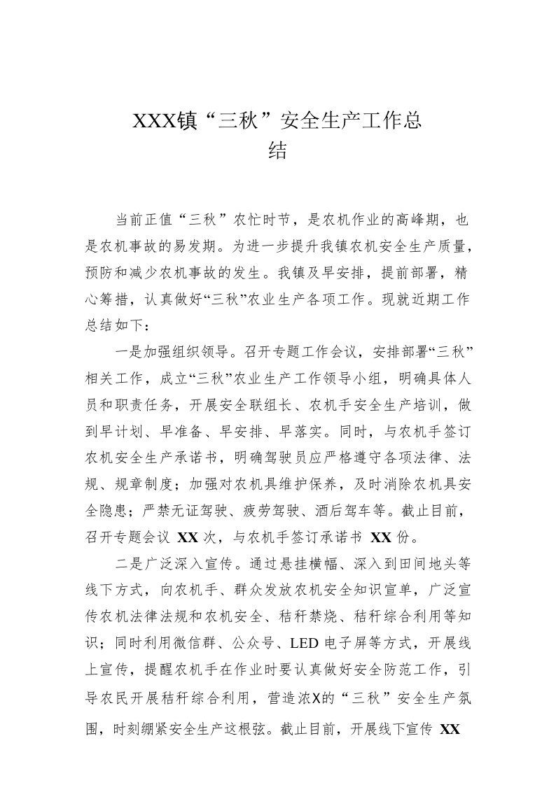 / XX镇“三秋”安全生产工作总结