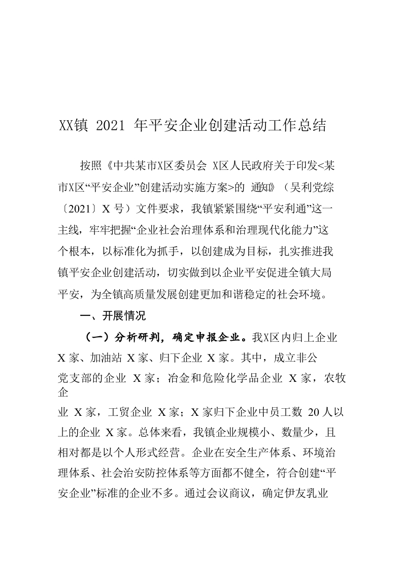 / XX镇2021年平安企业创建活动工作总结
