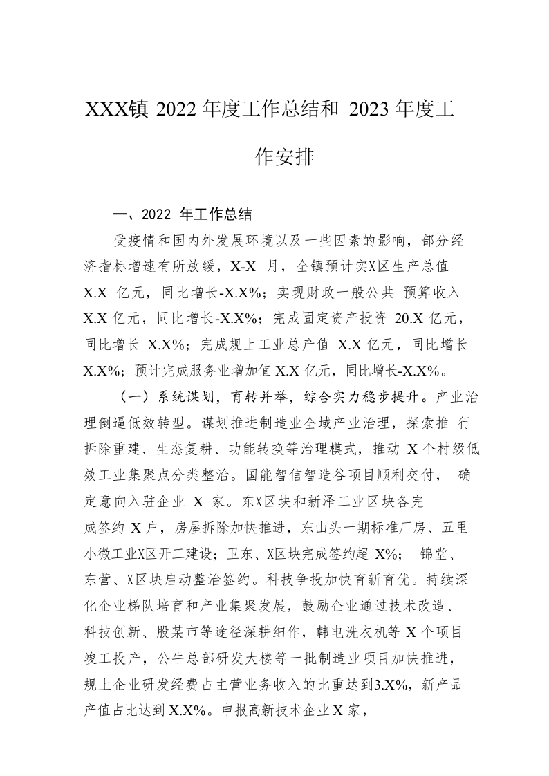 / XX镇2022年度工作总结和2023年度工作安排