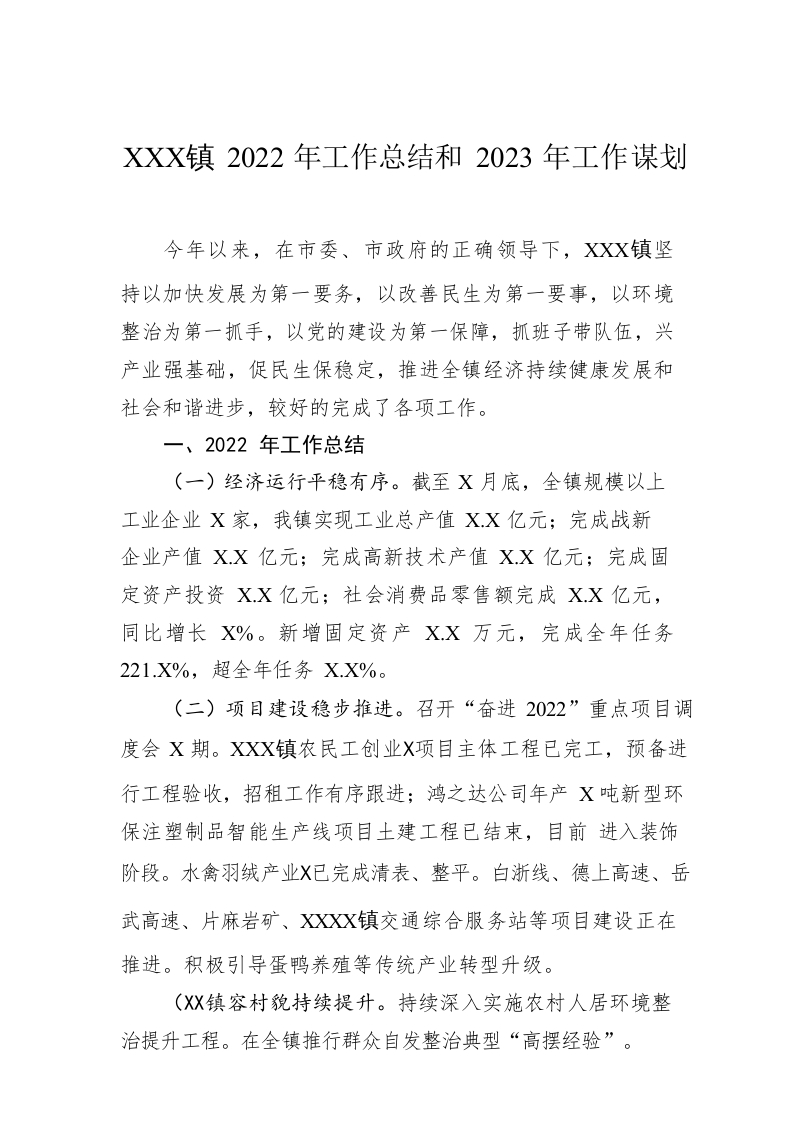 / XX镇2022年工作总结和2023年工作谋划