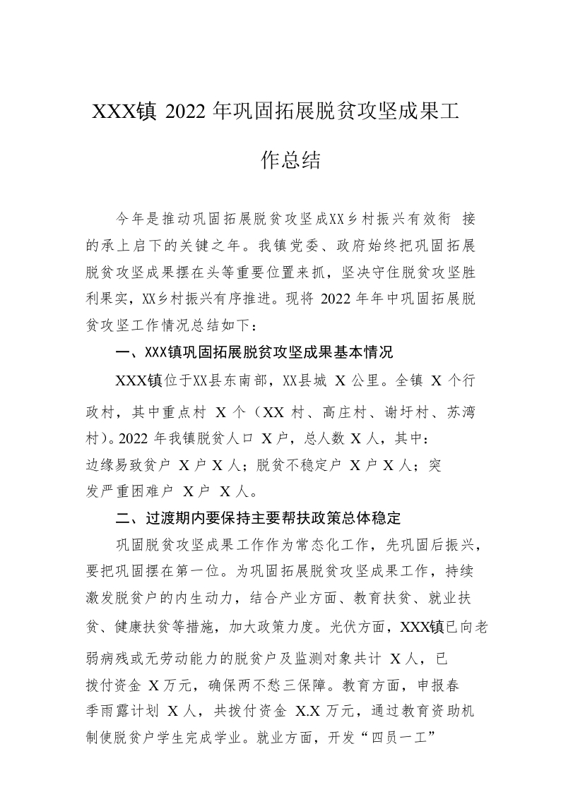 / XX镇2022年巩固拓展脱贫攻坚成果工作总结(20220909)