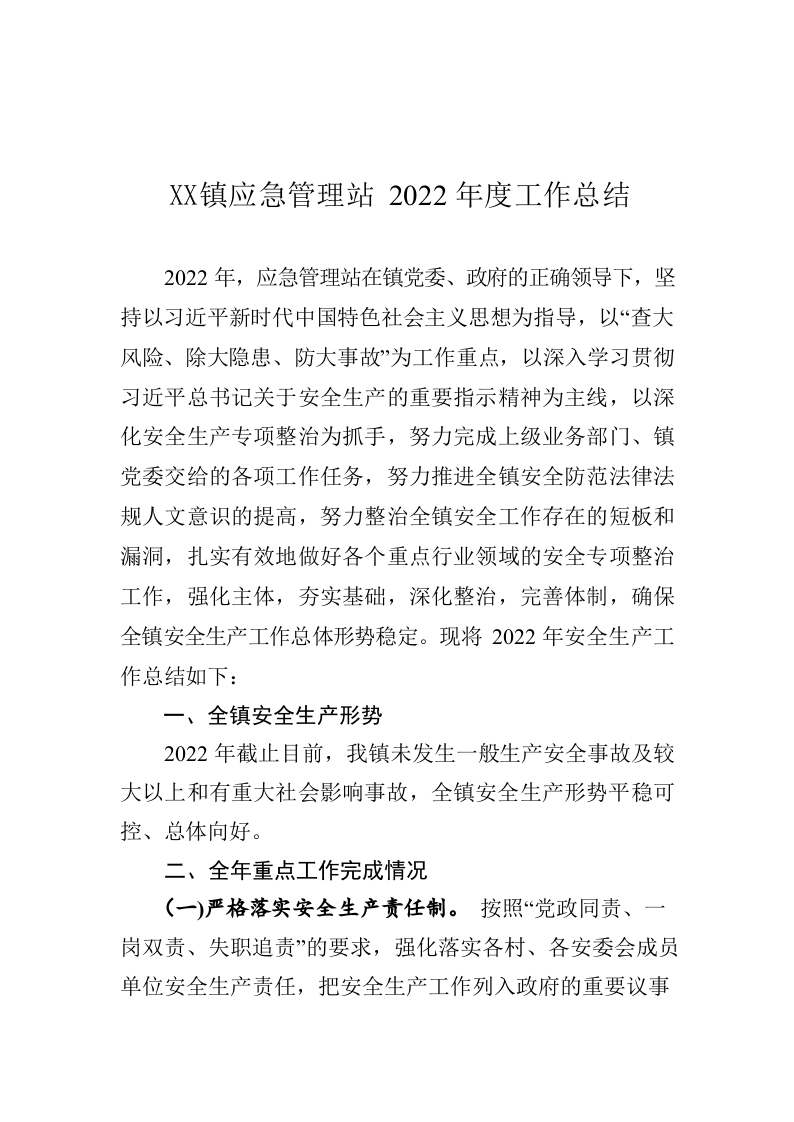 / XX镇应急管理站2022年度工作总结