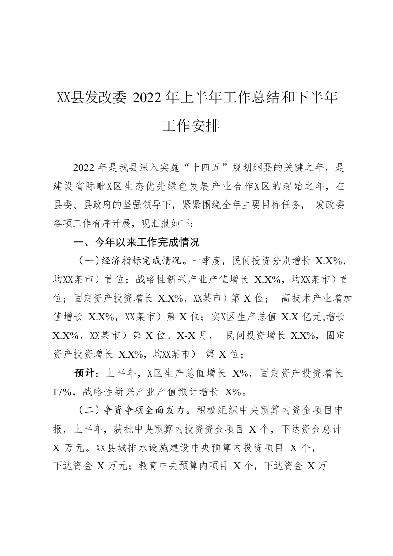 / X县发改委2022年上半年工作总结和下半年工作安排
