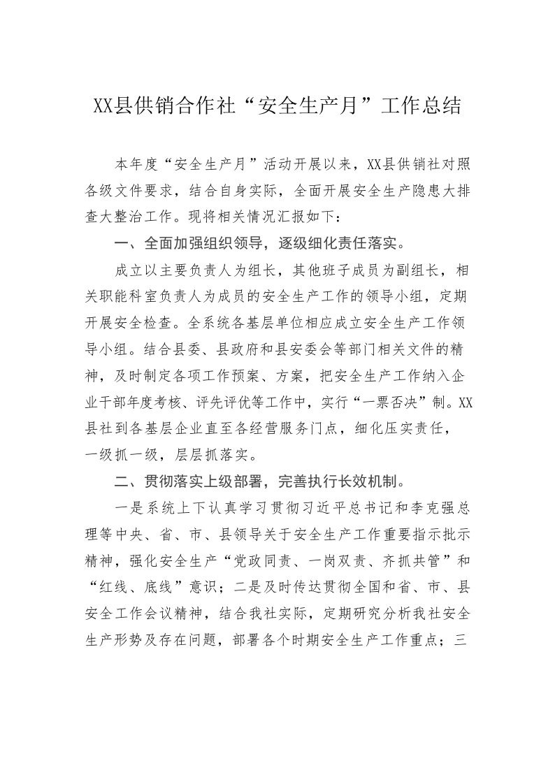 / X县供销合作社“安全生产月”工作总结