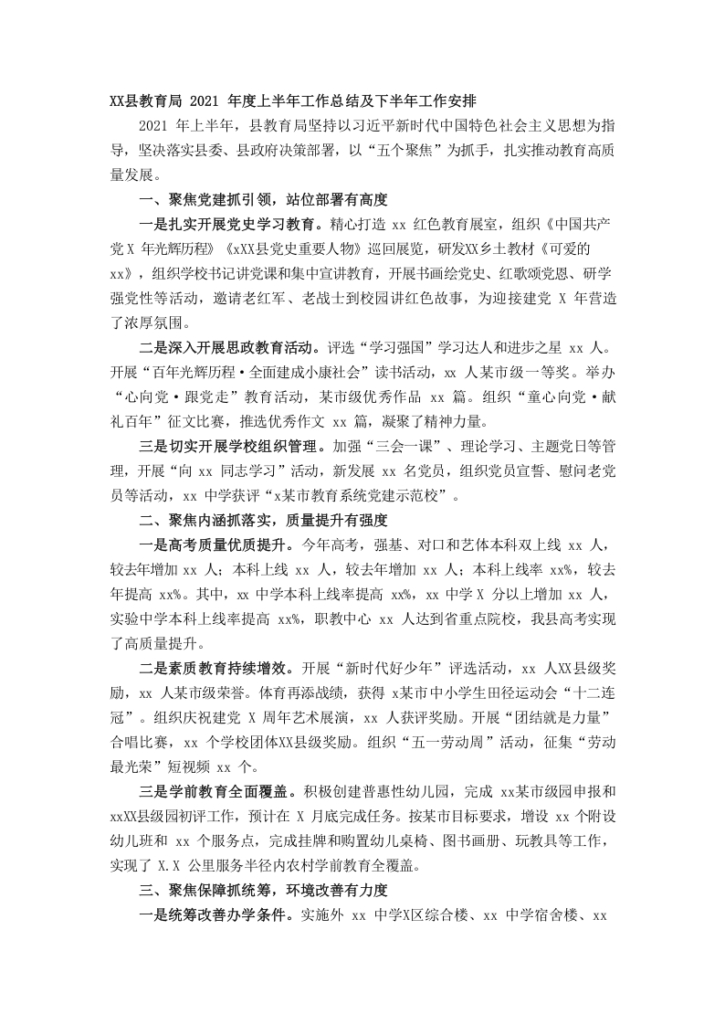/ X县教育局2021年度上半年工作总结及下半年工作安排