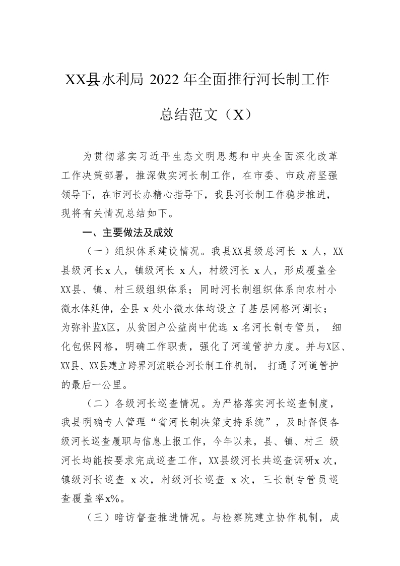 / x县水利局2022年全面推行河长制工作总结范文