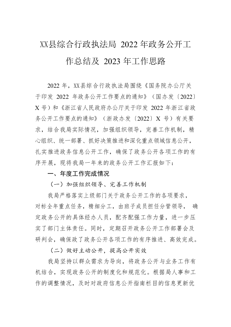 / X县综合行政执法局2022年政务公开工作总结及2023年工作思路(20221222)