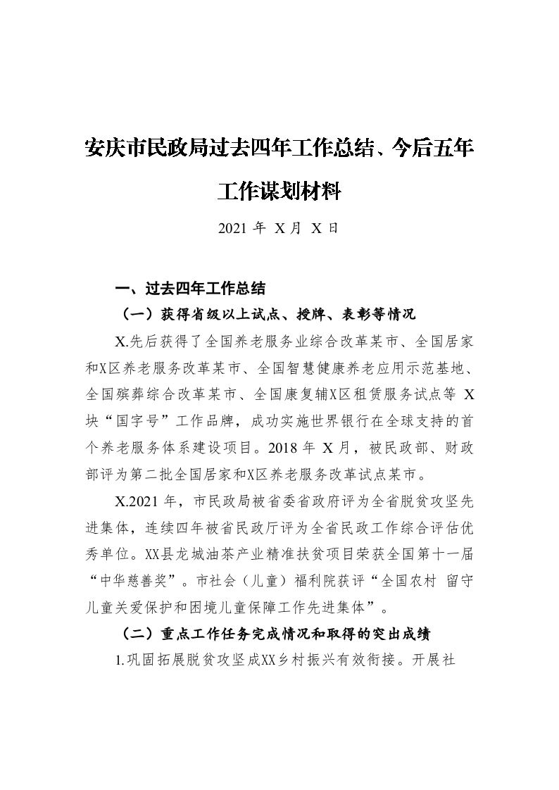 / 安庆市民政局过去四年工作总结、今后五年工作谋划材料(20211222)