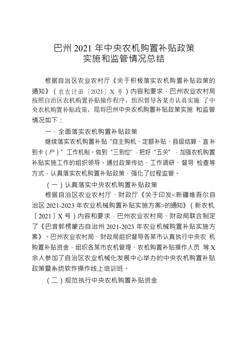 / 巴州2021年落实中央农机购置补贴政策工作总结