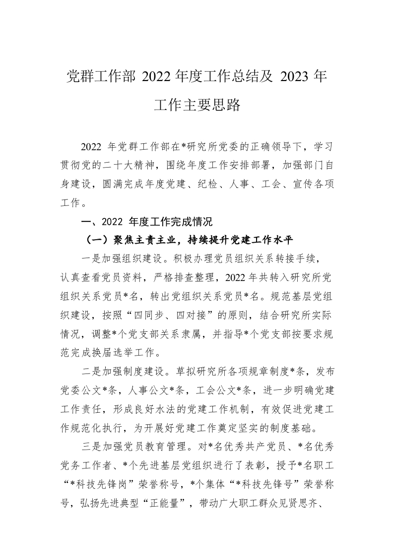 / 党群工作部2022年度工作总结及2023年工作主要思路