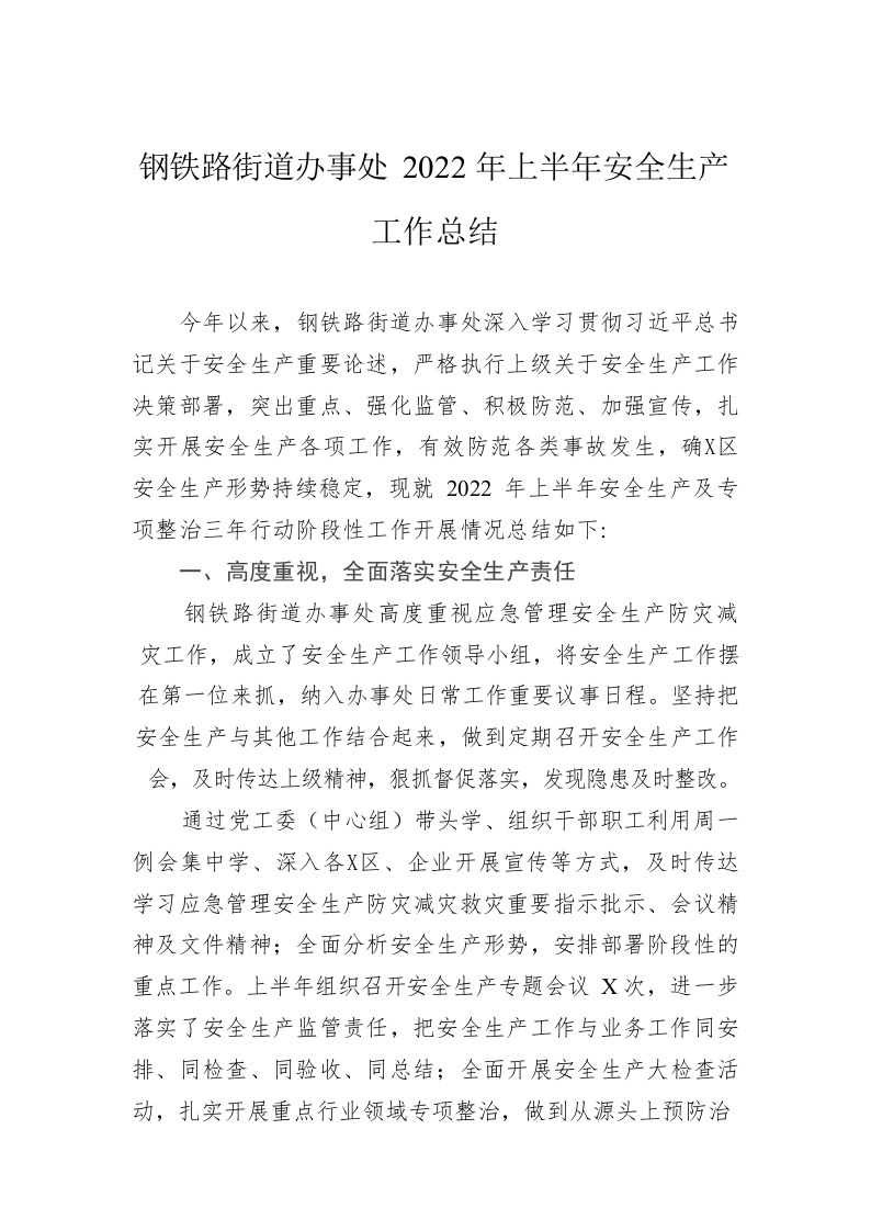 / 钢铁路街道办事处2022年上半年安全生产工作总结
