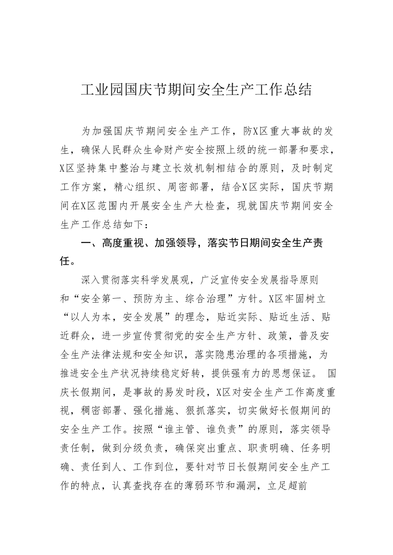 / 工业园国庆节期间安全生产工作总结