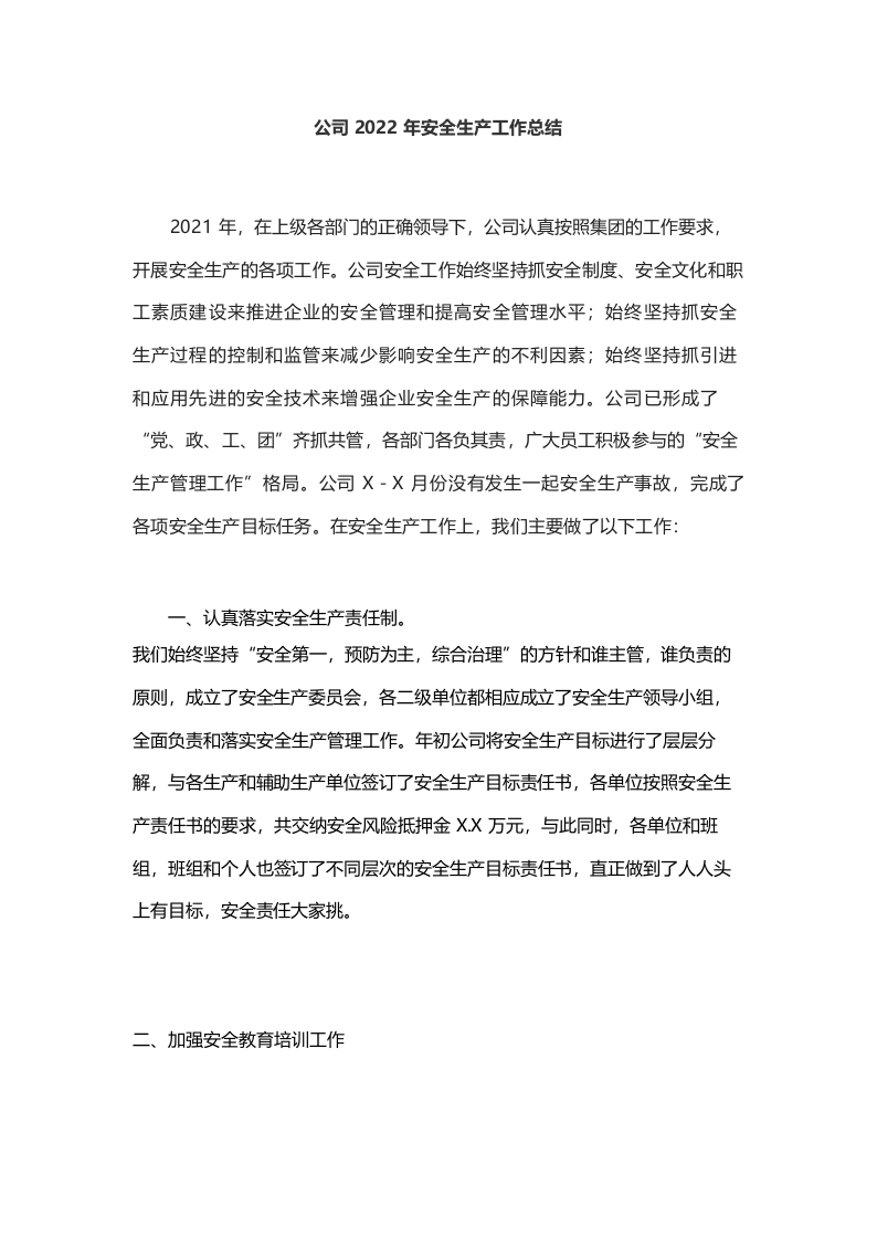 公司2022年安全生产工作总结
