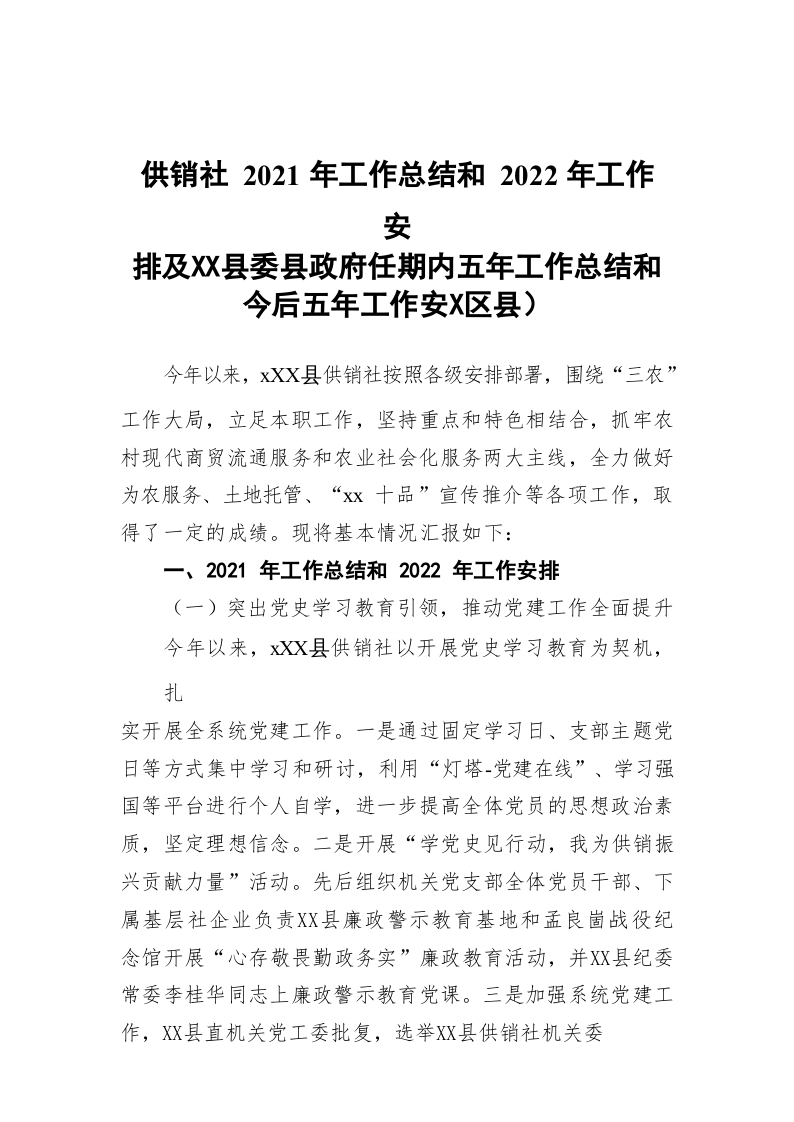 / 供销社2021年工作总结和2022年工作安排及本届县委县政府任期内五年工作总结和今后五年工作安排(区县)
