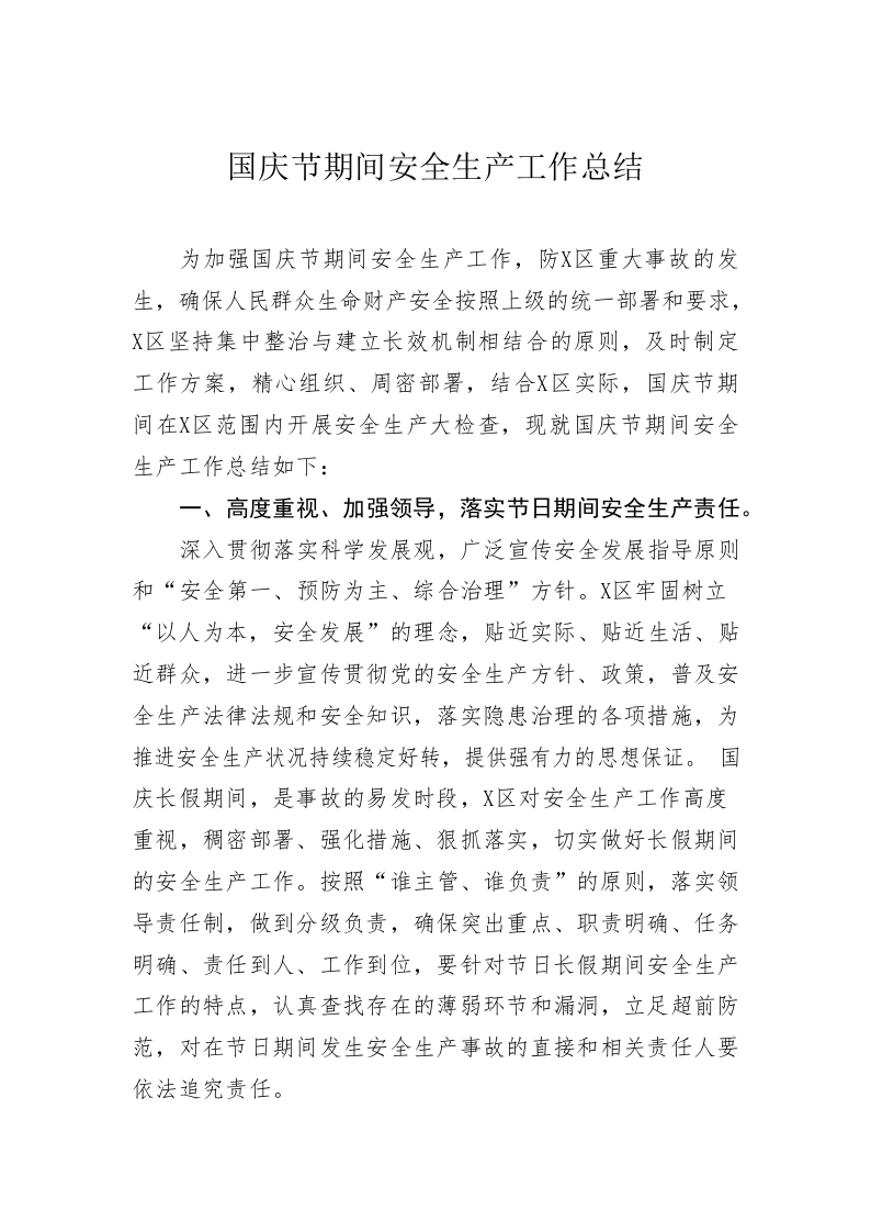 国庆节期间安全生产工作总结