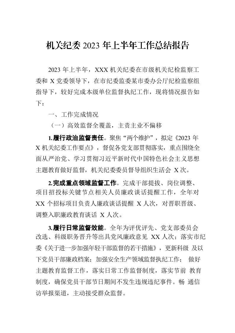 / 机关纪委2023年上半年工作总结报告