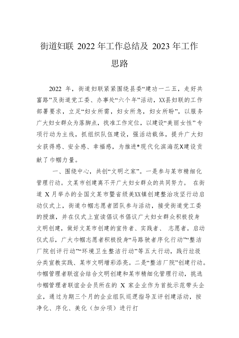 / 街道妇联2022年工作总结及2023年工作思路