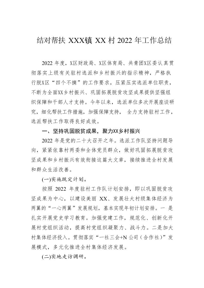 / 结对帮扶XX镇XX村2022年工作总结(20221231)