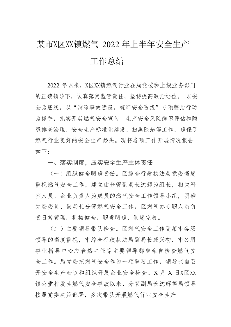 / 某区城镇燃气2022年上半年安全生产工作总结