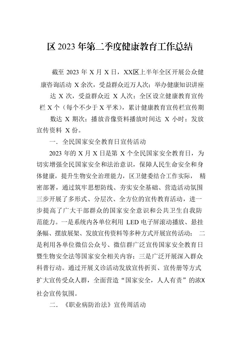 / 区2023年第二季度健康教育工作总结(20230703)