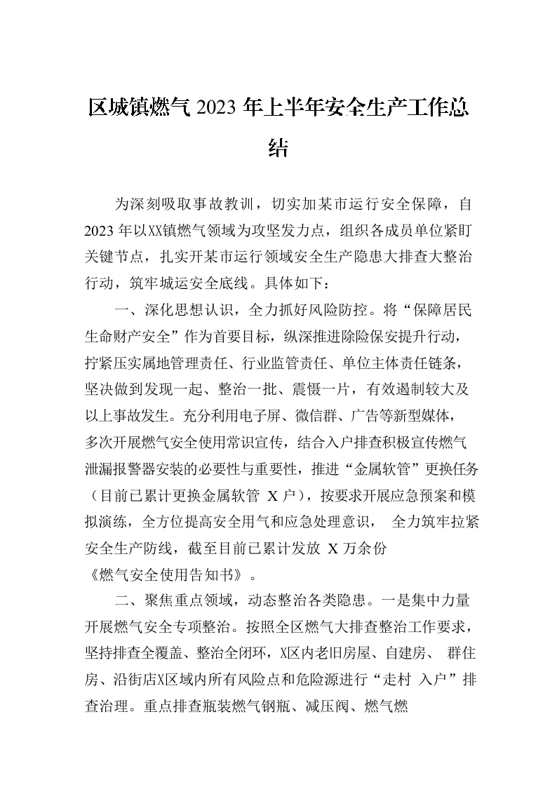 / 区城镇燃气2023年上半年安全生产工作总结(20230620)