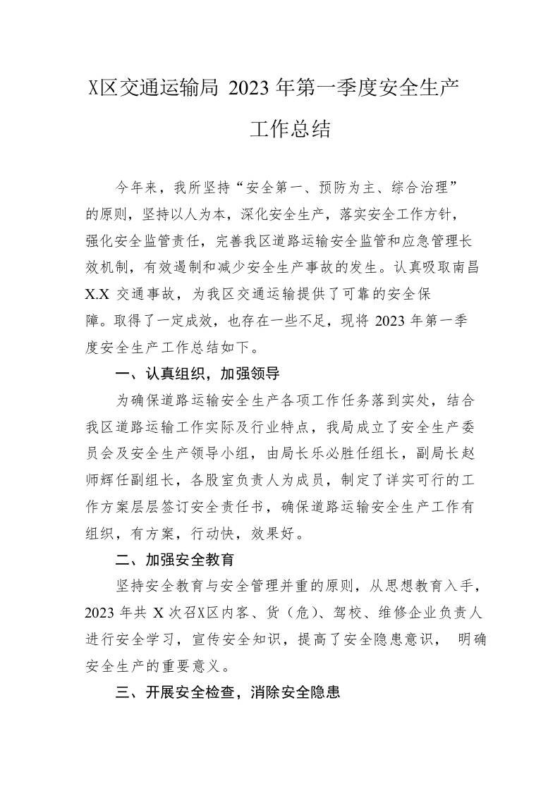 / 区交通运输局2023年第一季度安全生产工作总结