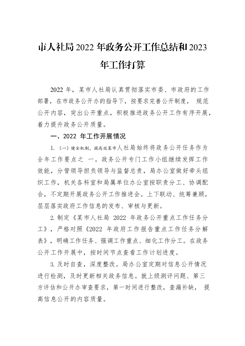 市人社局2022年政务公开工作总结和2023年工作打算