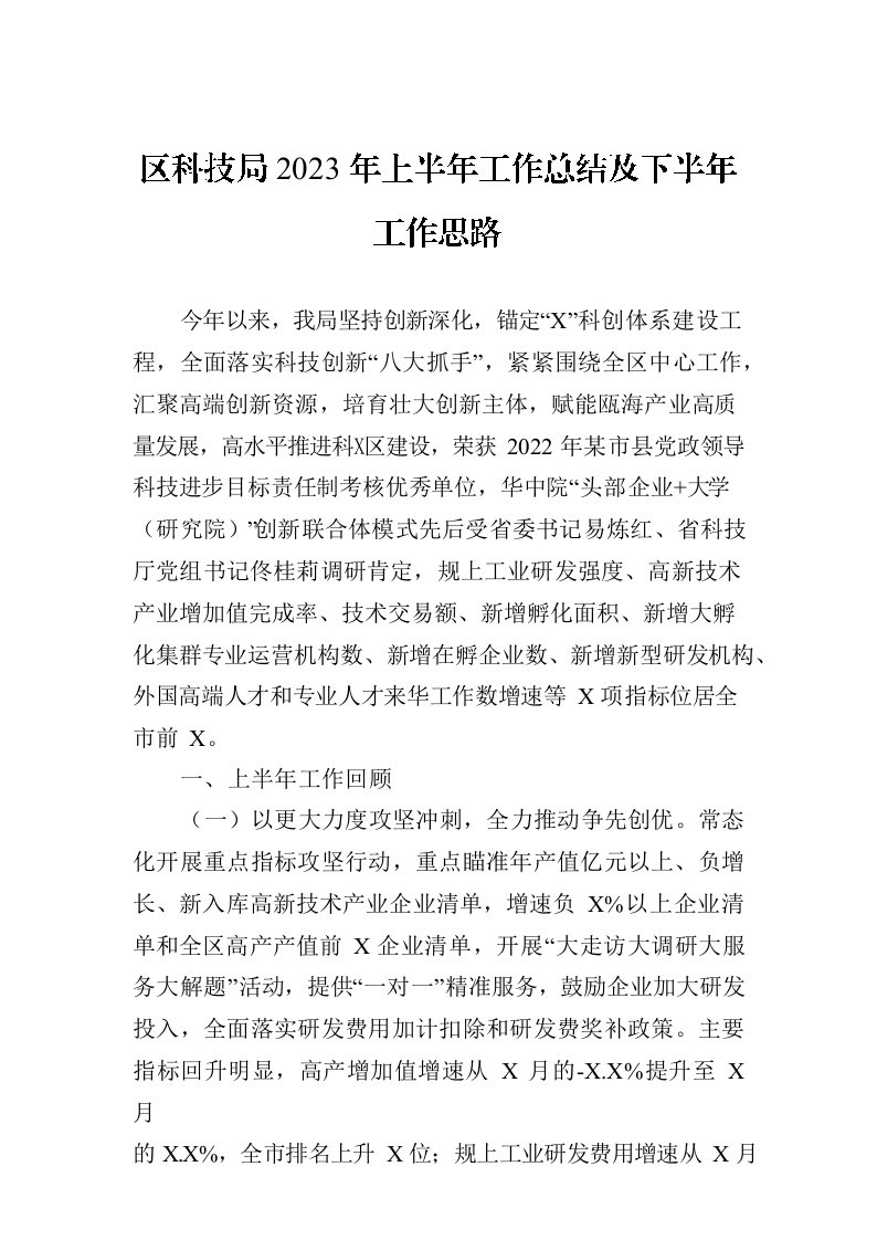/ 区科技局2023年上半年工作总结及下半年工作思路(20230629)
