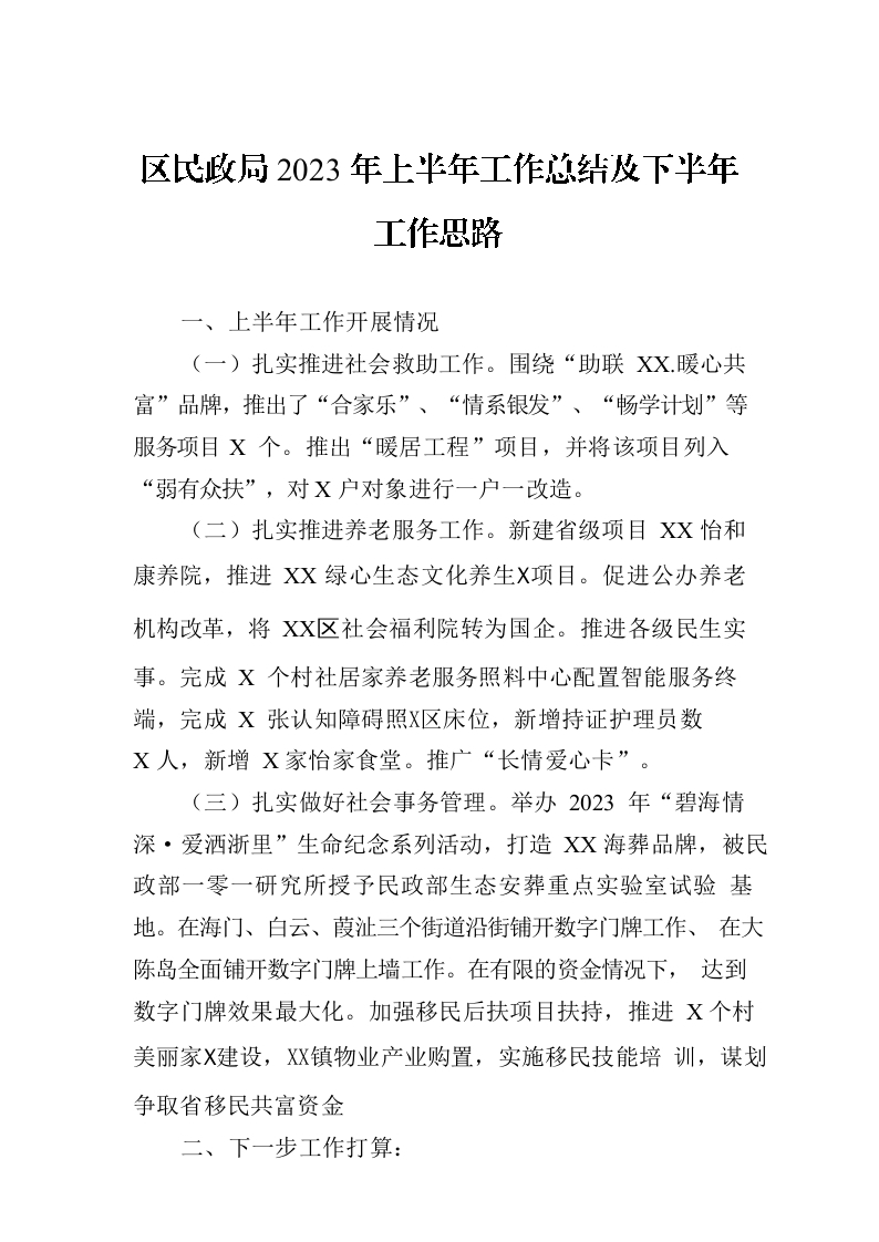 / 区民政局2023年上半年工作总结及下半年工作思路(20230703)