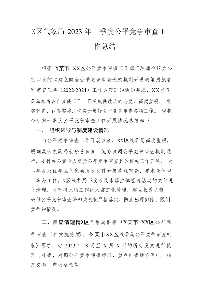 区气象局2023年一季度公平竞争审查工作总结