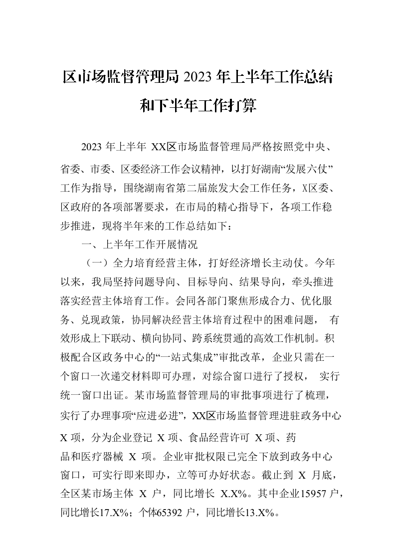 / 区市场监督管理局2023年上半年工作总结和下半年工作打算