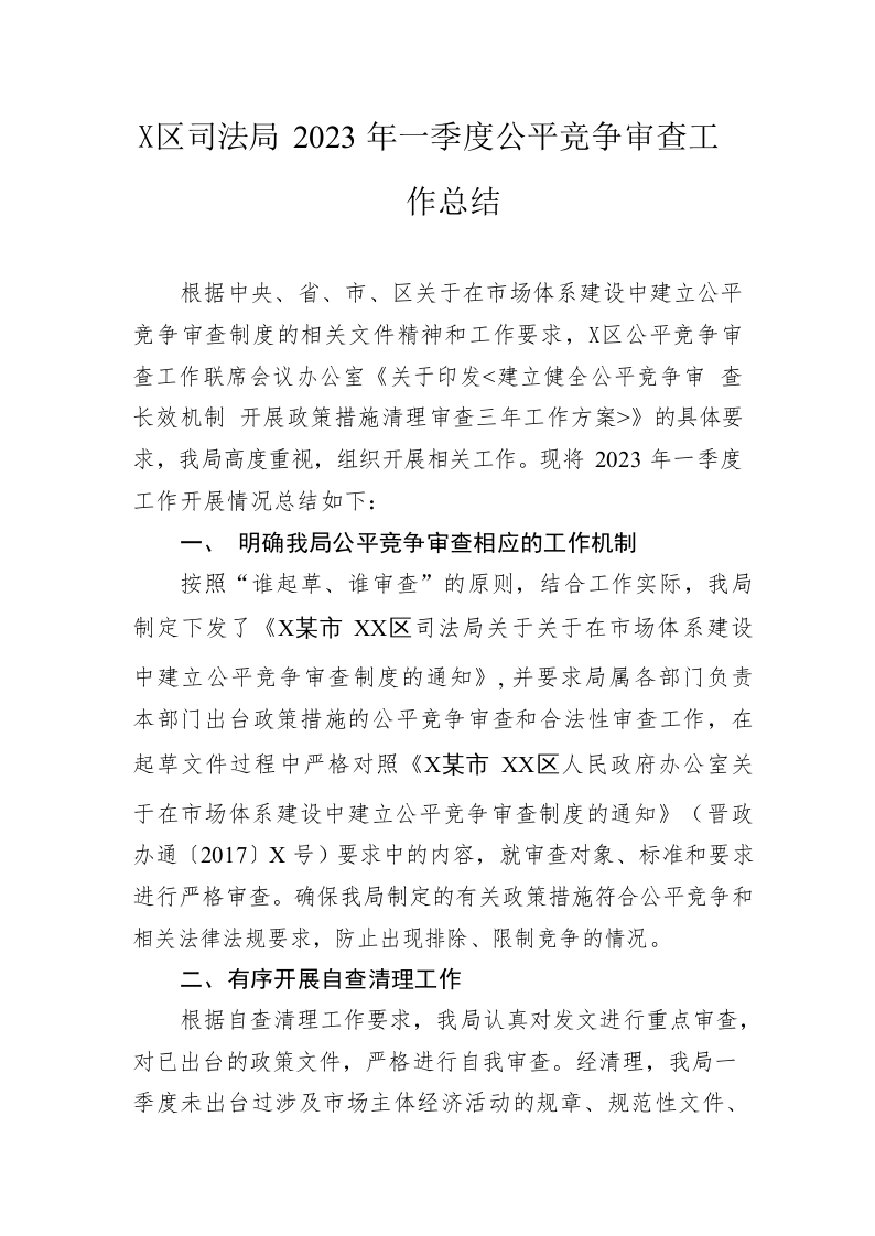 / 区司法局2023年一季度公平竞争审查工作总结